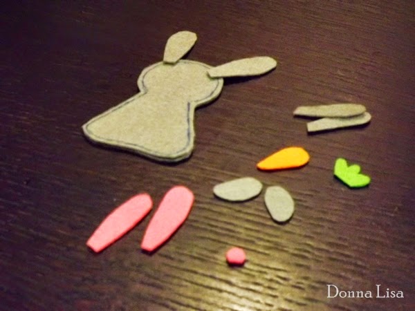 Escolhi um feltro cinzento e outro rosa para pequenos apontamentos (orelhas e nariz). E como é óbvio, um coelho tem de andar sempre acompanhado de uma cenoura, por isso também precisei de um pedacinho de feltro laranja e outro verde.