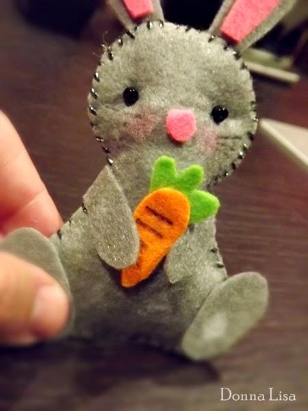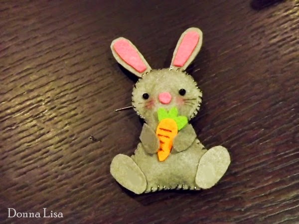 As restantes partes foram coladas ao corpo com cola para tecido e as missangas cosidas na cara, assim como o alfinete que foi cosido nas costas do coelhinho.