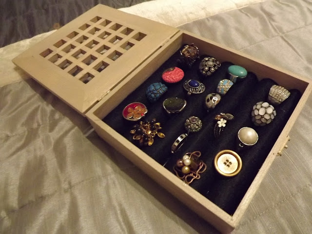 Depois fiz uns rolinhos de feltro para colocar no interior, colei-os ao fundo da caixa e TXARAMMMM: uma caixa personalizada para guardar todos os meus anéis! Pelo menos para já.... Muahahahahh!...